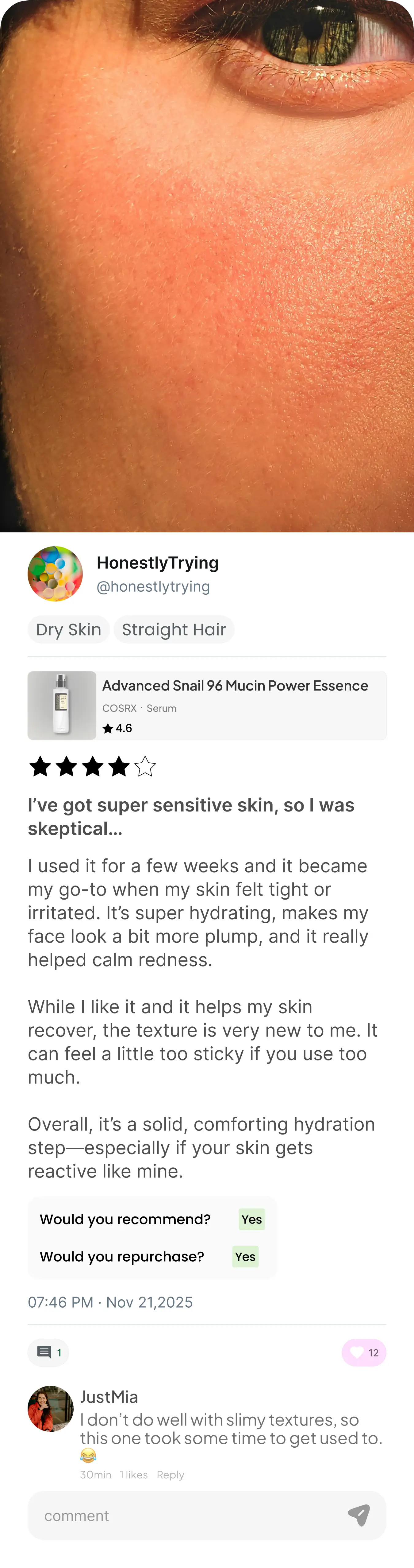 I have sensitive skin so I like that it doesn't have any scent. It does give hydration without feeling too heavy on my skin! However, I don't use it regularly only once in a while.